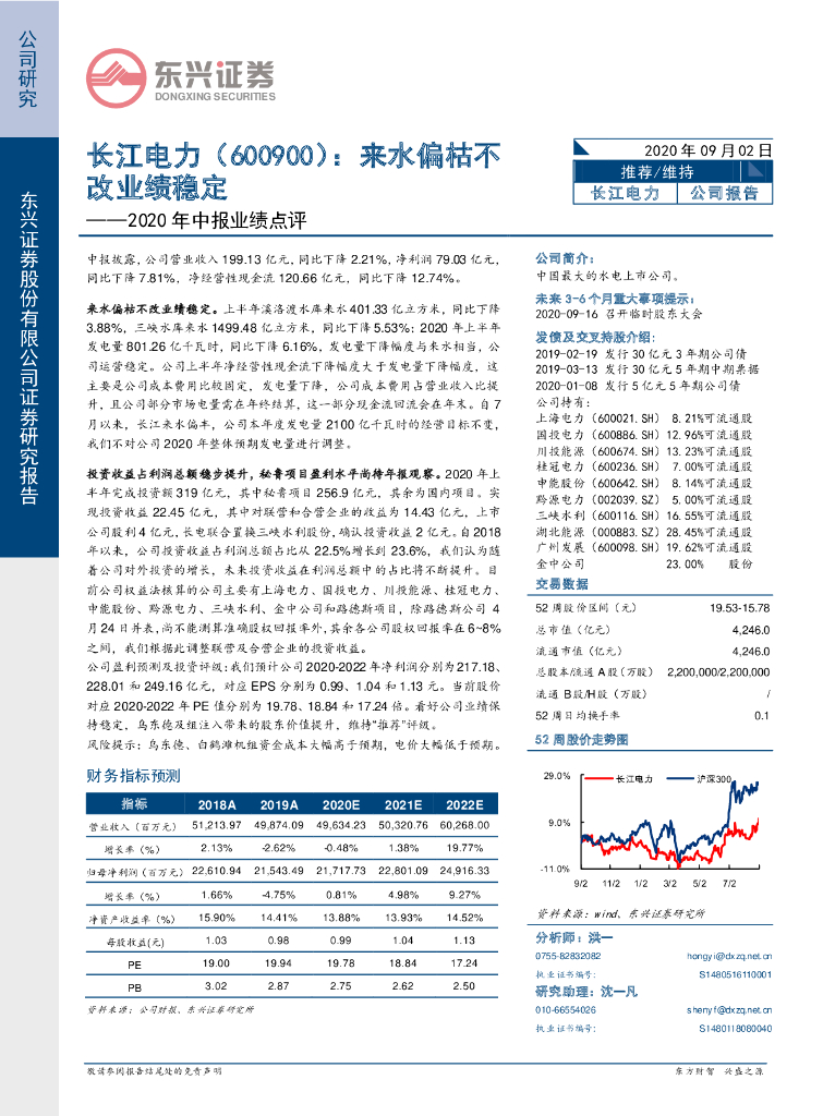 东兴证券:长江电力(600900)-2020年中报业绩点评:来水偏枯不改业绩稳定.pdf