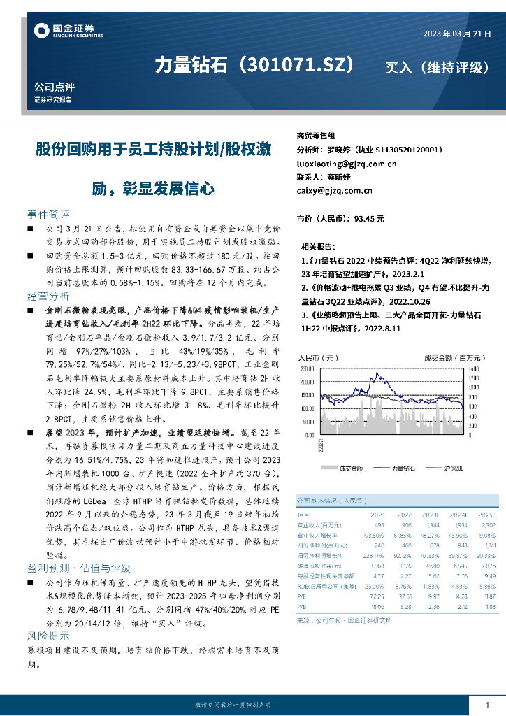 国金证券:力量钻石(301071)-股份回购用于员工持股计划/股权激励,彰显发展信心.pdf