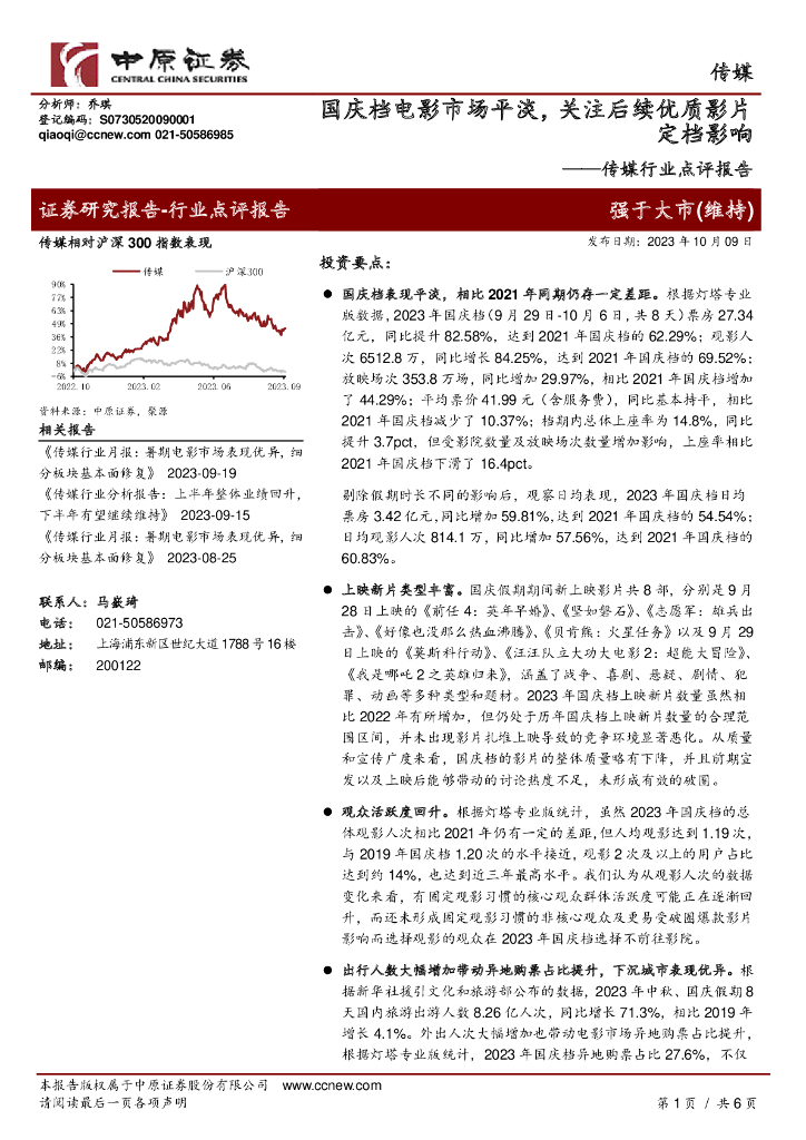 中原证券:传媒行业点评报告:国庆档电影市场平淡,关注后续优质影片定档影响.pdf