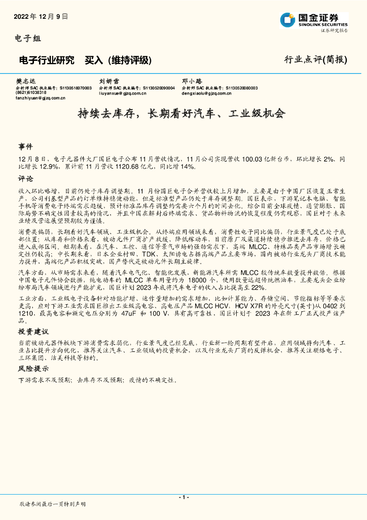 国金证券:电子行业研究:持续去库存,长期看好汽车、工业级机会.pdf