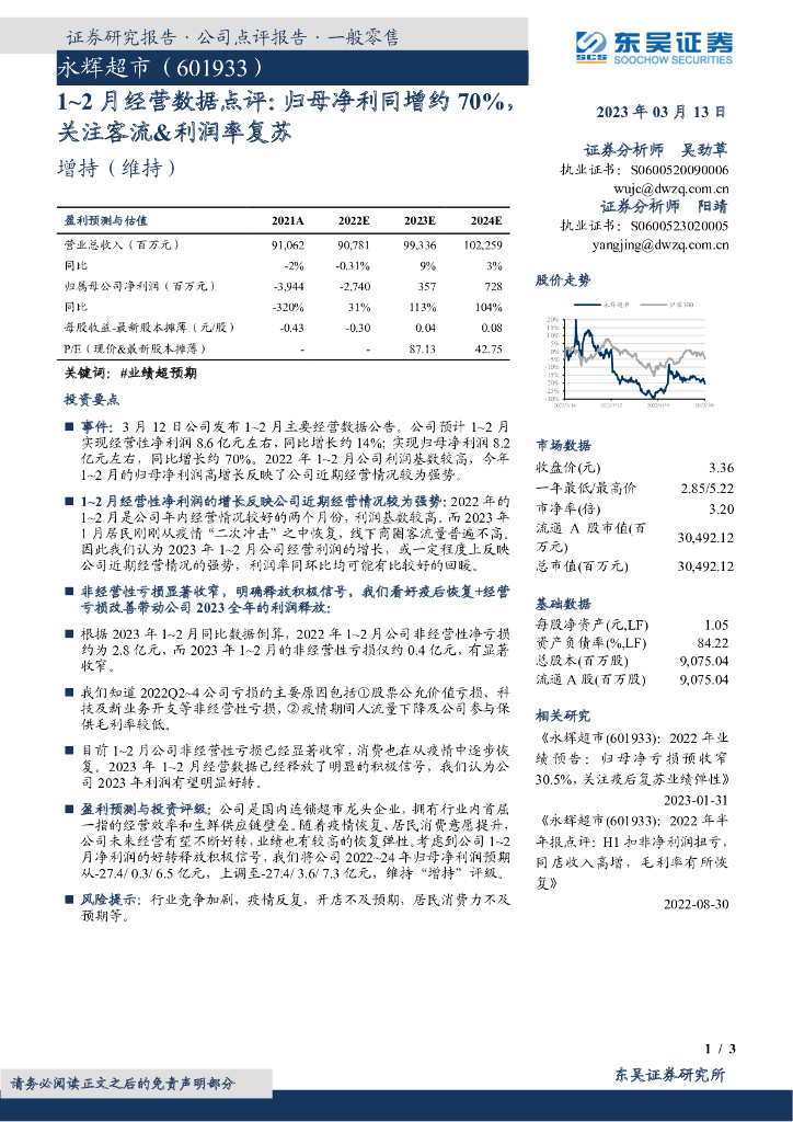 东吴证券:永辉超市(601933)-1~2月经营数据点评:归母净利同增约70%,关注客流&利润率复苏.pdf