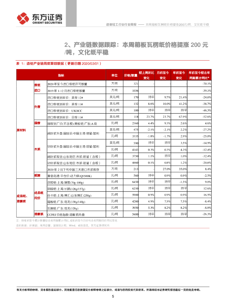 东方证券:造纸产业链数据每周速递:本周箱板瓦楞纸价格提涨200元/吨,文化纸平稳.pdf