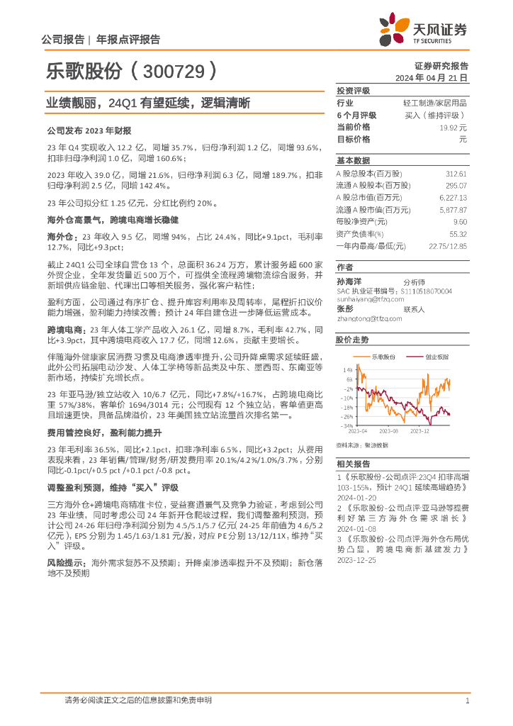 天风证券:乐歌股份(300729)-业绩靓丽,24Q1有望延续,逻辑清晰.pdf