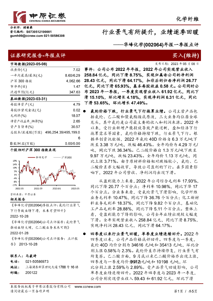 中原证券:华峰化学(002064)-年报一季报点评:行业景气有所提升,业绩逐季回暖.pdf