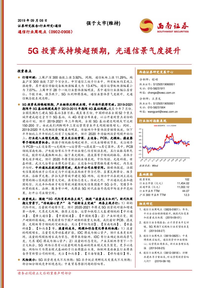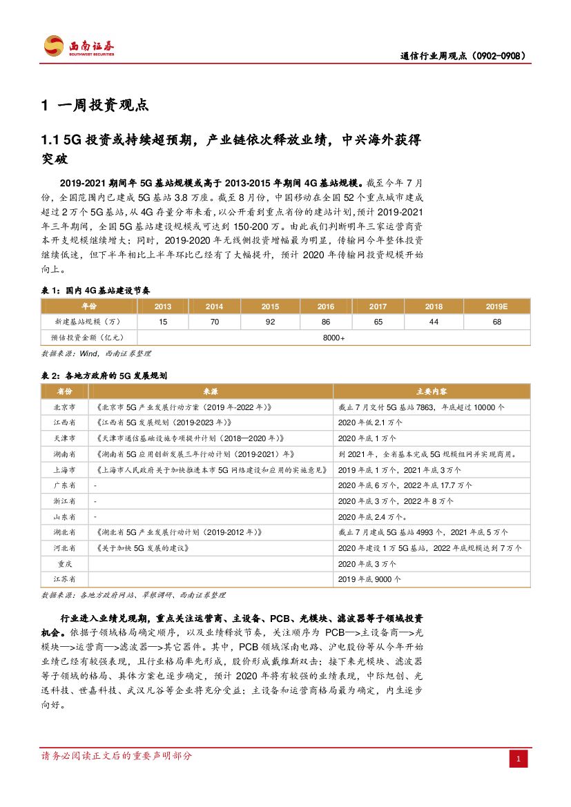 西南证券:通信行业周观点:5G投资或持续超预期,光通信景气度提升.pdf