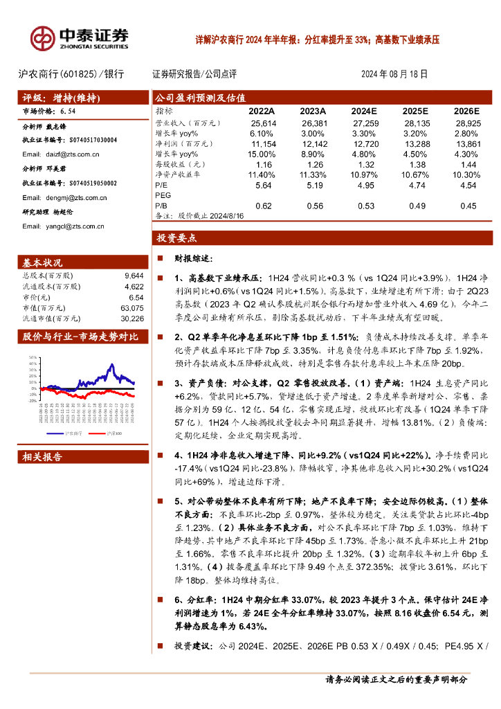 中泰证券:详解沪农商行2024年半年报:分红率提升至33%;高基数下业绩承压.pdf