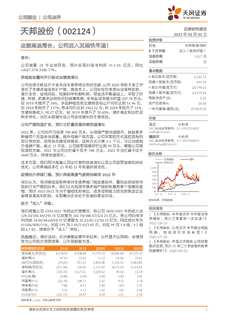 天风证券:天邦股份(002124)-业绩高速增长,公司进入发展快车道!.pdf