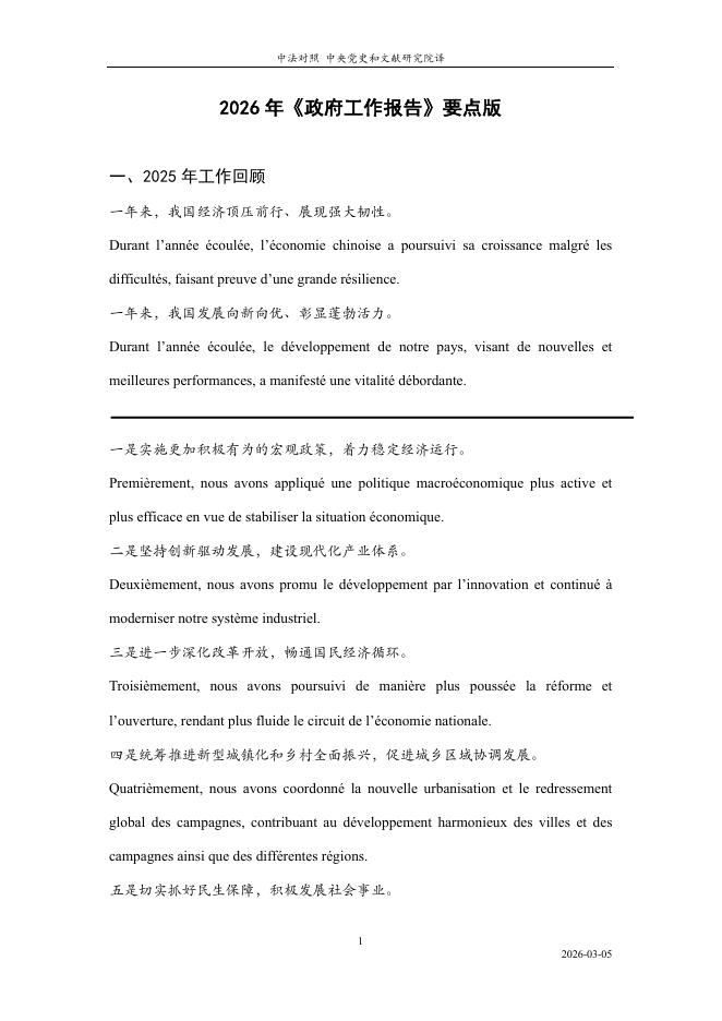 中央党史和文献研究院:2026年《政府工作报告》要点版(中法对照).pdf