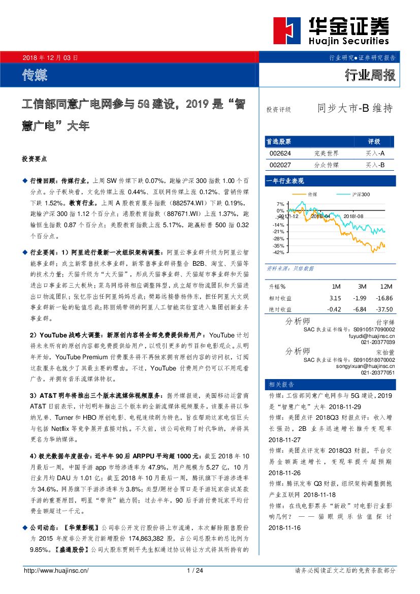 华金证券:传媒行业周报:工信部同意广电网参与5G建设,2019是“智慧广电”大年.pdf