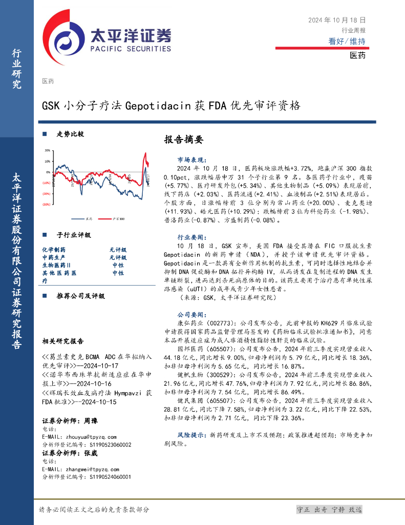 太平洋证券:医药行业周报:GSK小分子疗法Gepotidacin获FDA优先审评资格.pdf