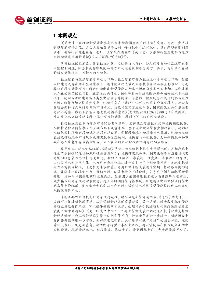 首创证券:公用事业行业简评报告:发改委发文进一步推动新型储能参与电力市场.pdf