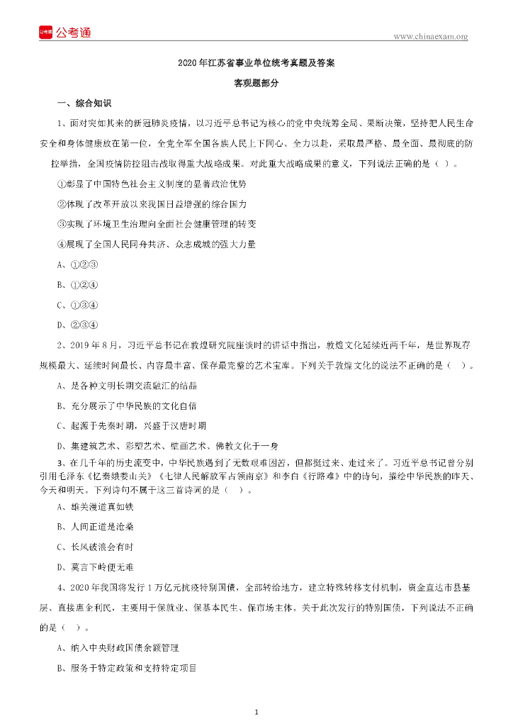 2020年江苏事业单位统考笔试真题及答案(完整版).pdf