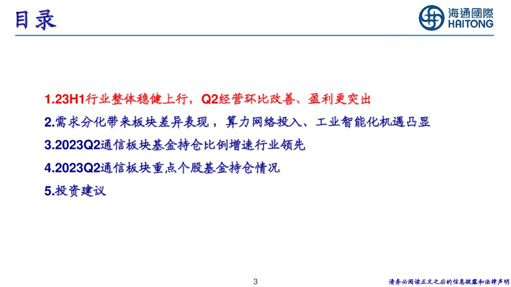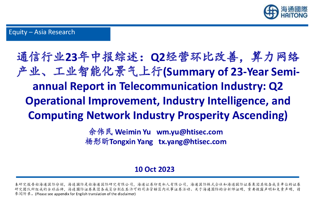 海通国际:通信行业23年中报综述:Q2经营环比改善,算力网络产业、工业智能化景气上行.pdf