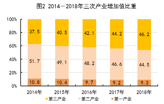 初步核算,全省生产总值实现36010.3亿元,比上年增长6.6%。其中,第一产业增加值3338.0亿元,增长3.0%;第二产业增加值16040.1亿元,增长4.3%;第三产业增加值16632.2亿元,增长9.8%。三次产业比例由上年的9.2:46.6:44.2,调整为9.3:44.5:46.2,第三产业比重首次超过第二产业。全省人均地区生产总值为47772元,比上年增长6.0%。