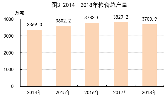 全年粮食播种面积653.9万公顷,比上年下降1.8%;粮食总产量3700.9万吨,下降3.4%。其中,夏粮产量1466.5万吨,下降3.6%;秋粮产量2234.4万吨,下降3.2%。