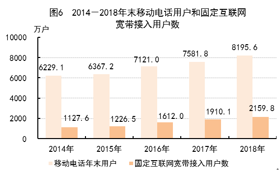 年末电话用户总数8865.6万户,其中移动电话用户8195.6万户。移动电话普及率上升至114.4部/百人。固定电话用户669.9万户,其中,城市电话用户568.0万户,农村电话用户101.9万户。固定互联网宽带接入用户2159.8万户,比上年末净增249.7万户,其中固定互联网光纤宽带接入用户2047.7万户,比上年末净增262.3万户;互联网用户6904.2万户,比上年末净增692.4万户。移动互联网接入流量30.9亿G,比上年增长2倍。手机上网用户6299.1万人,比上年末净增390.5万人。