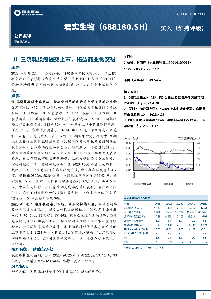 国金证券:君实生物(688180)-1L三阴乳腺癌提交上市,拓益商业化突破.pdf