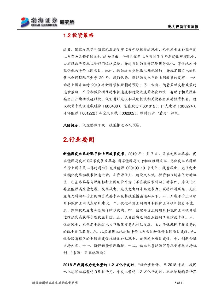 渤海证券:电力设备行业周报:新能源发电无补贴平价上网政策发布.pdf