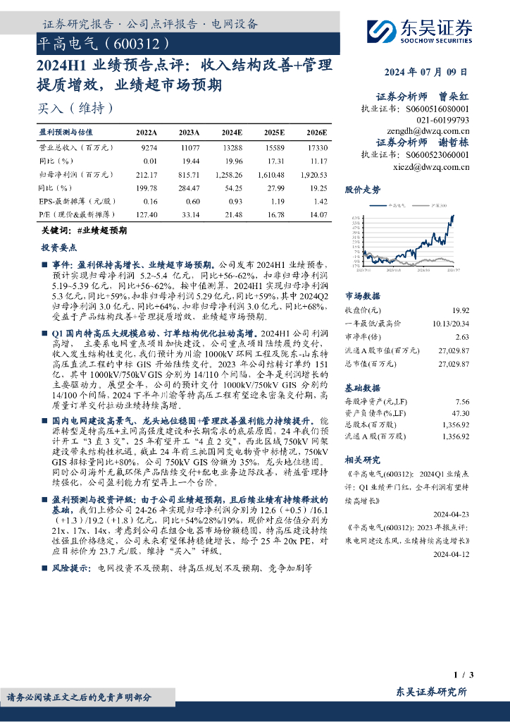 东吴证券:平高电气(600312)-2024H1业绩预告点评:收入结构改善+管理提质增效,业绩超市场预期.pdf