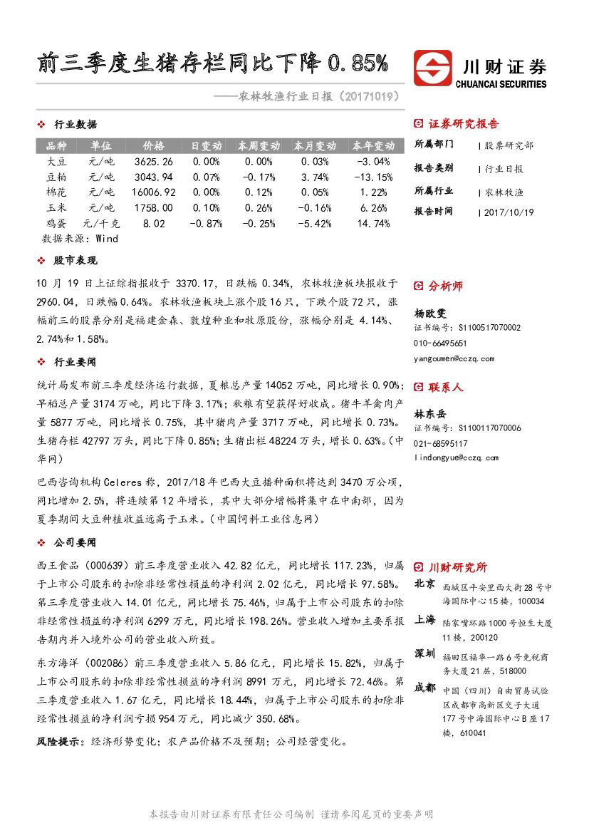 川财证券:农林牧渔行业日报:前三季度生猪存栏同比下降0.85%.pdf
