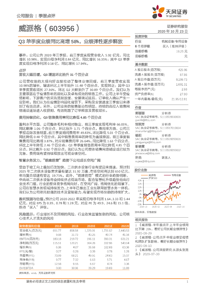 天风证券:威派格(603956)-Q3单季度业绩同比高增58%,业绩弹性逐步释放.pdf