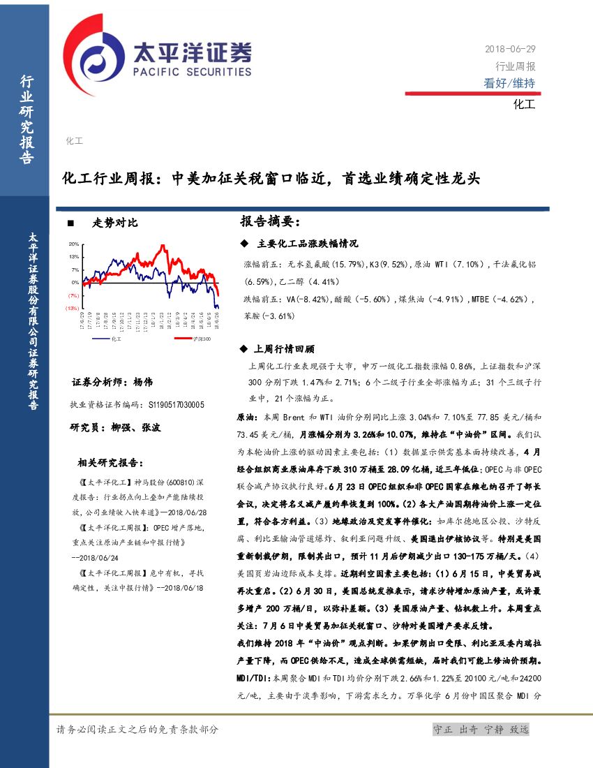 太平洋证券:化工行业周报:中美加征关税窗口临近,首选业绩确定性龙头.pdf