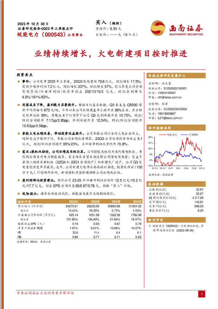 西南证券:皖能电力(000543)-2023年三季报点评:业绩持续增长,火电新建项目按时推进.pdf