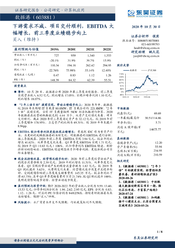 东吴证券:数据港(603881)-下游需求不减、项目交付顺利,EBITDA大幅增长,前三季度业绩稳步向上.pdf