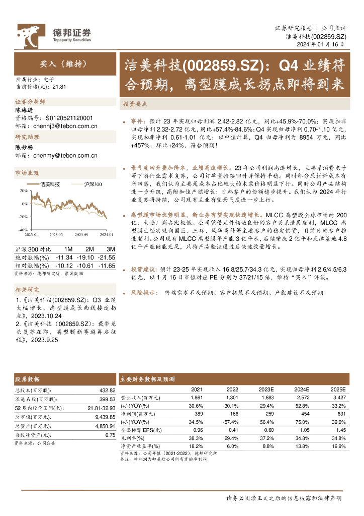 德邦证券:洁美科技(002859)-Q4业绩符合预期,离型膜成长拐点即将到来.pdf