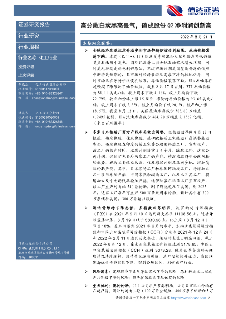 信达证券:化工行业周报:高分散白炭黑高景气,确成股份Q2净利润创新高.pdf