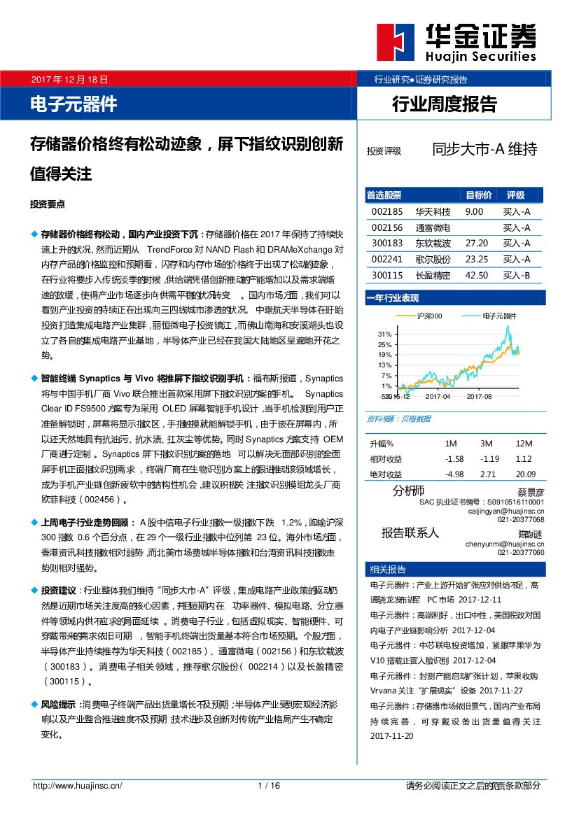 华金证券:电子元器件行业周度报告:存储器价格终有松动迹象,屏下指纹识别创新值得关注.pdf