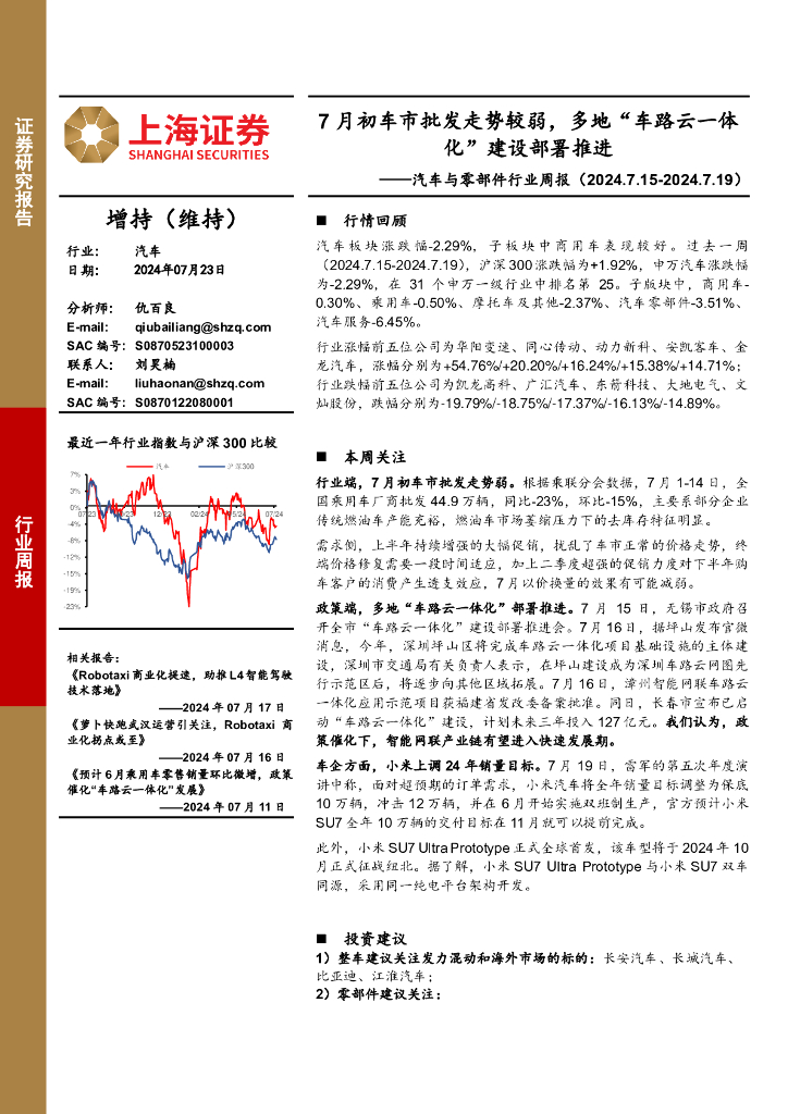 上海证券:汽车与零部件行业周报:7月初车市批发走势较弱,多地“车路云一体化”建设部署推进.pdf