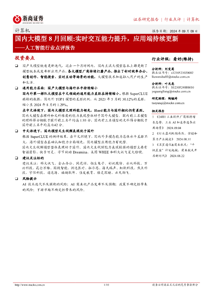 浙商证券:计算机人工智能行业点评报告-国内大模型8月回顾:实时交互能力提升,应用端持续更新.pdf