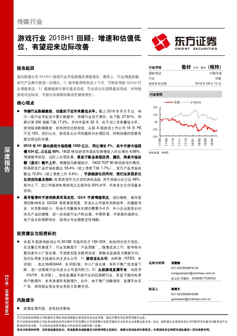 东方证券:游戏行业2018H1回顾:增速和估值低位,有望迎来边际改善.pdf