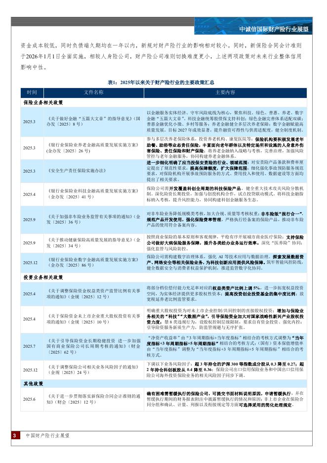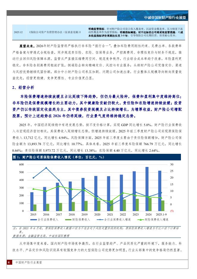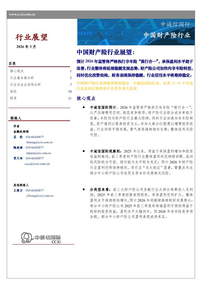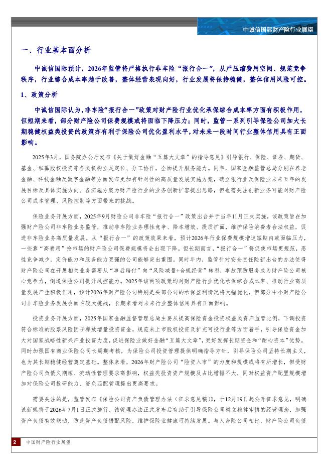 中诚信国际:中国财产险行业展望:预计2026年监管将严格执行非车险“报行合一”,承保盈利水平趋于改善,行业整体将延续稳健发展态势,财产险公司加快向非车险转型,同时优化投资结构,财务表现保持稳健,行业信用水平将维持稳定。.pdf