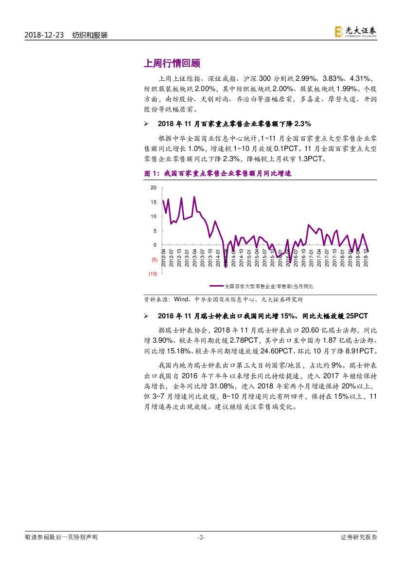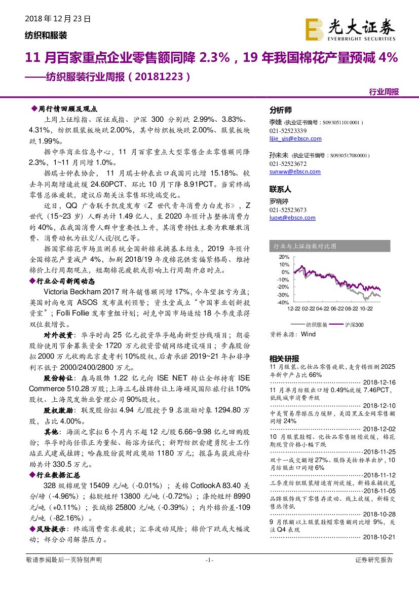 光大证券:纺织服装行业周报:11月百家重点企业零售额同降2.3%,19年我国棉花产量预减4%.pdf