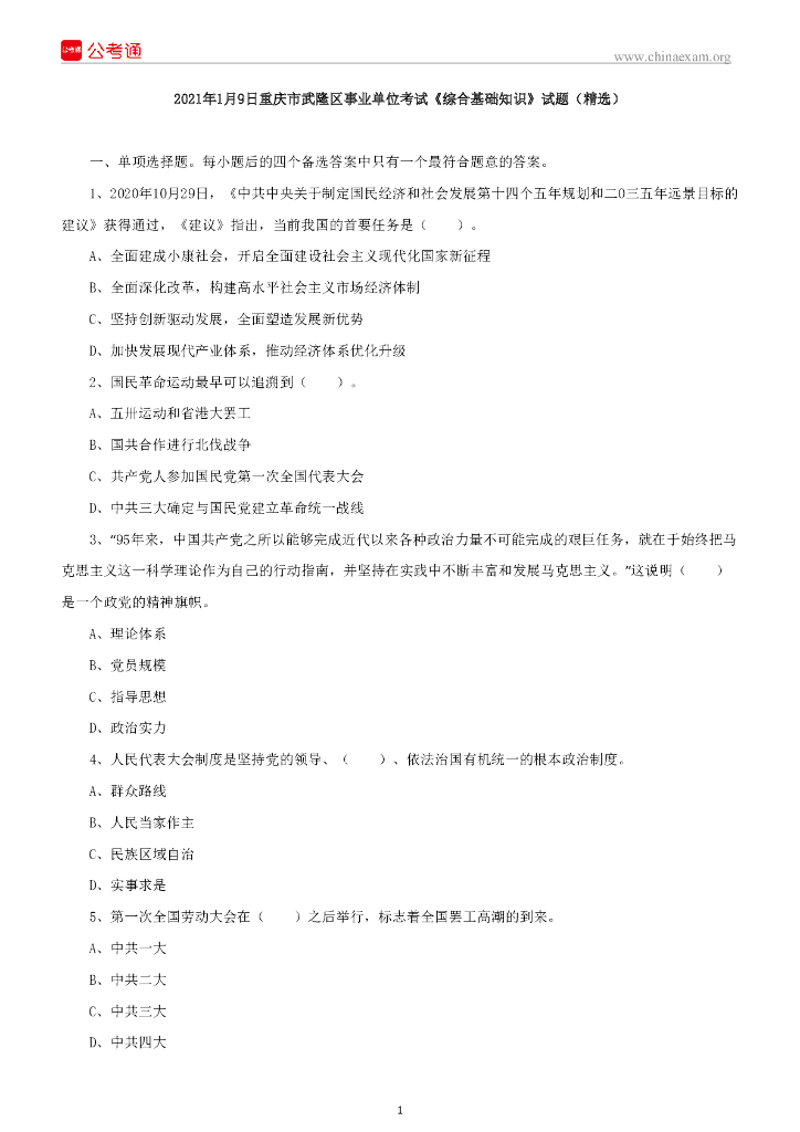2021年1月9日重庆市武隆区事业单位考试《综合基础知识》试题(精选).pdf