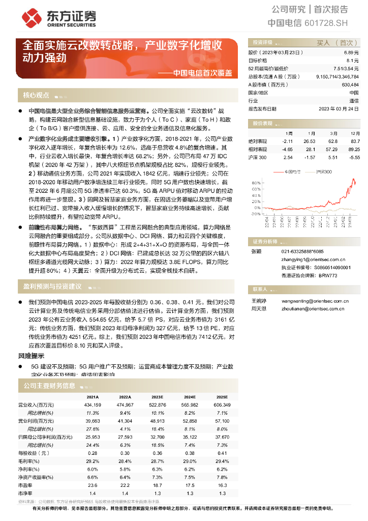 东方证券:中国电信首次覆盖:全面实施云改数转战略,产业数字化增收动力强劲.pdf