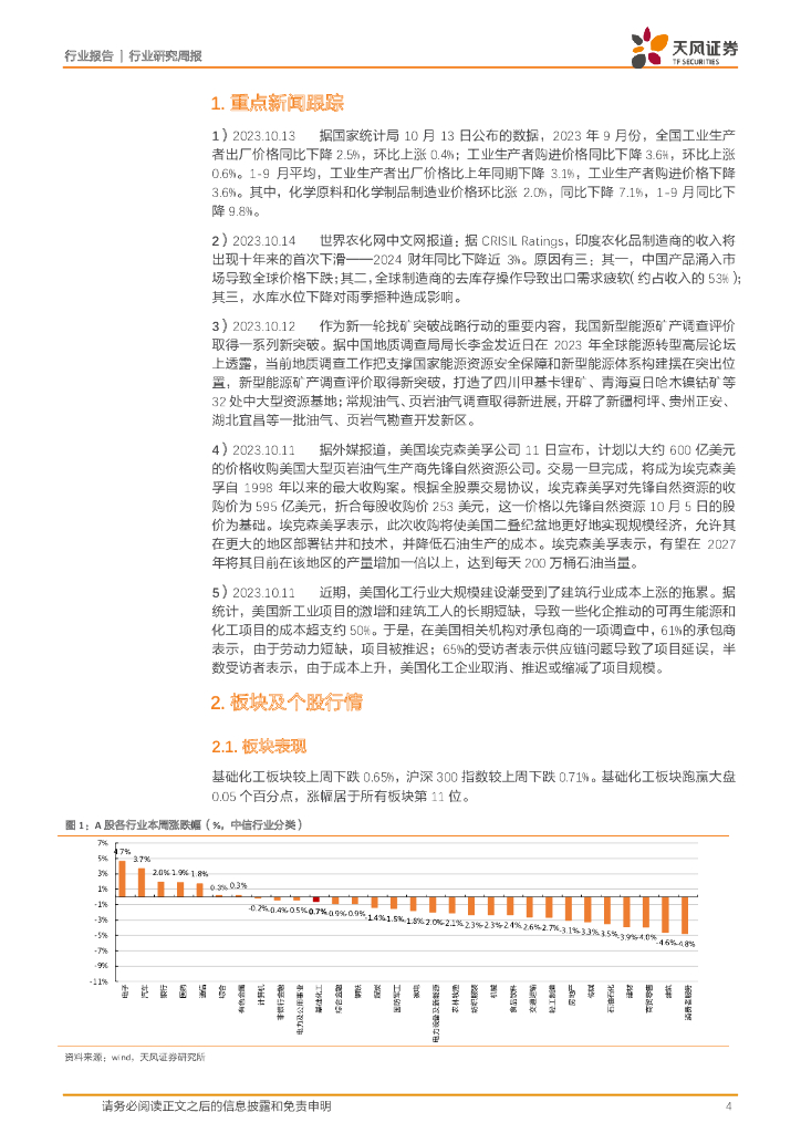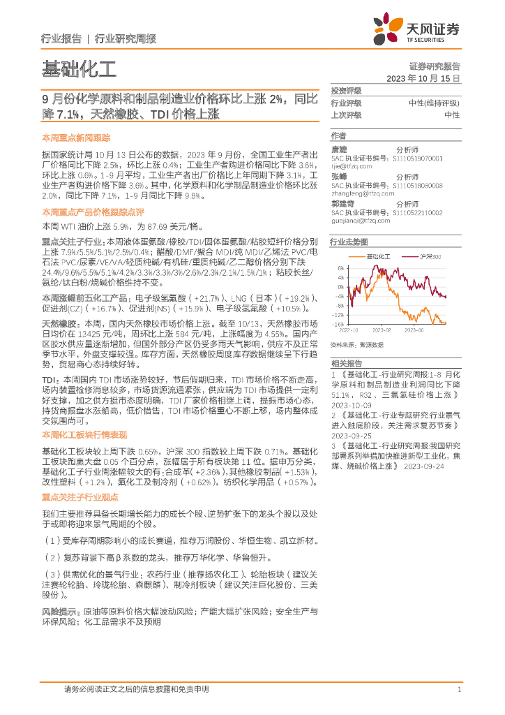 天风证券:基础化工行业研究周报:9月份化学原料和制品制造业价格环比上涨2%,同比降7.1%,天然橡胶、TDI价格上涨.pdf
