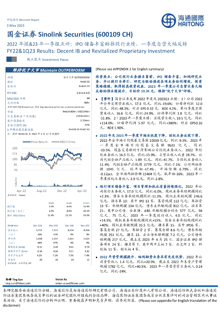 海通国际:国金证券(600109)-2022年报&23年一季报点评:IPO储备丰富助推投行业绩,一季度自营大幅反转.pdf