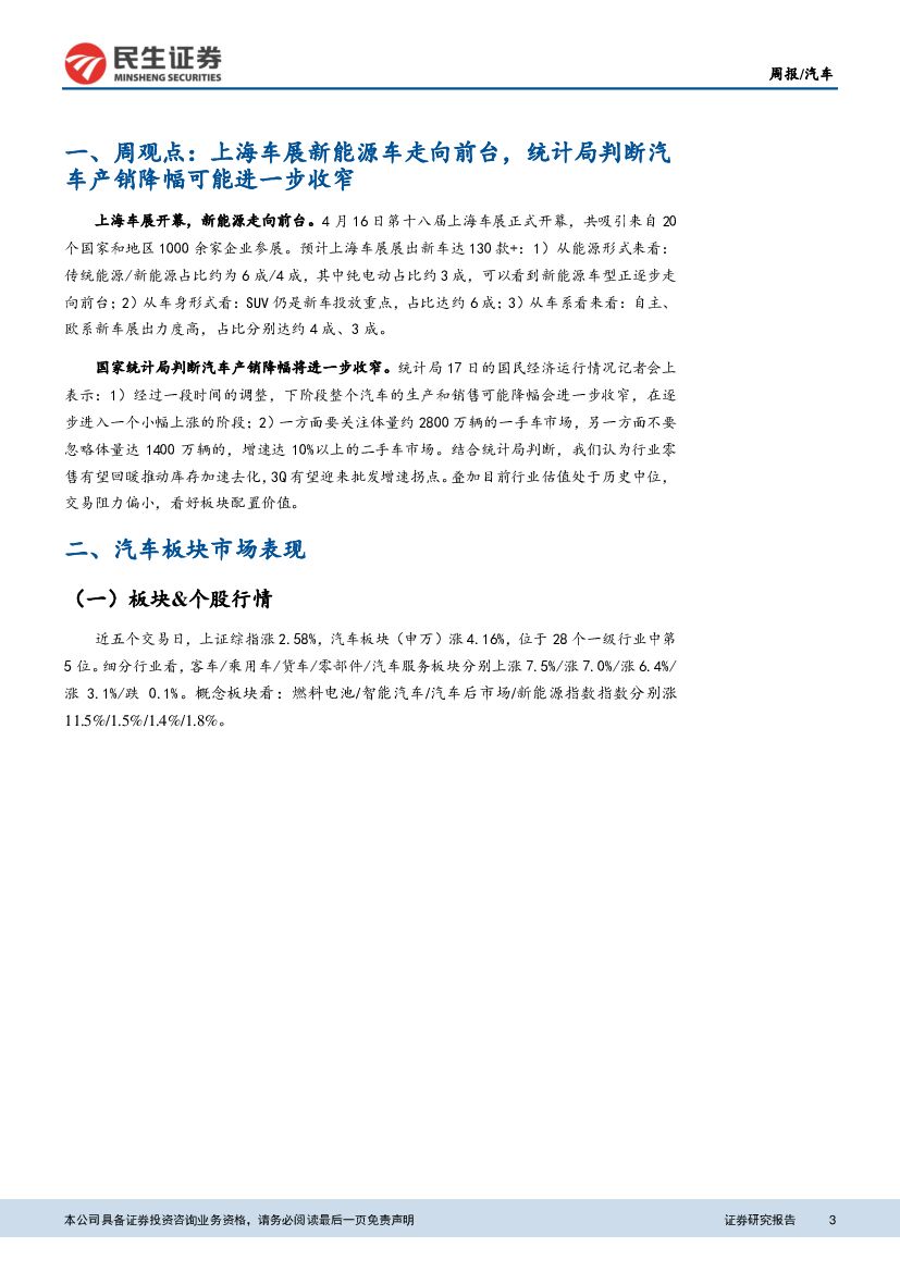 民生证券:汽车周报:上海车展新能源车走向前台,统计局判断汽车产销降幅可能进一步收窄.pdf