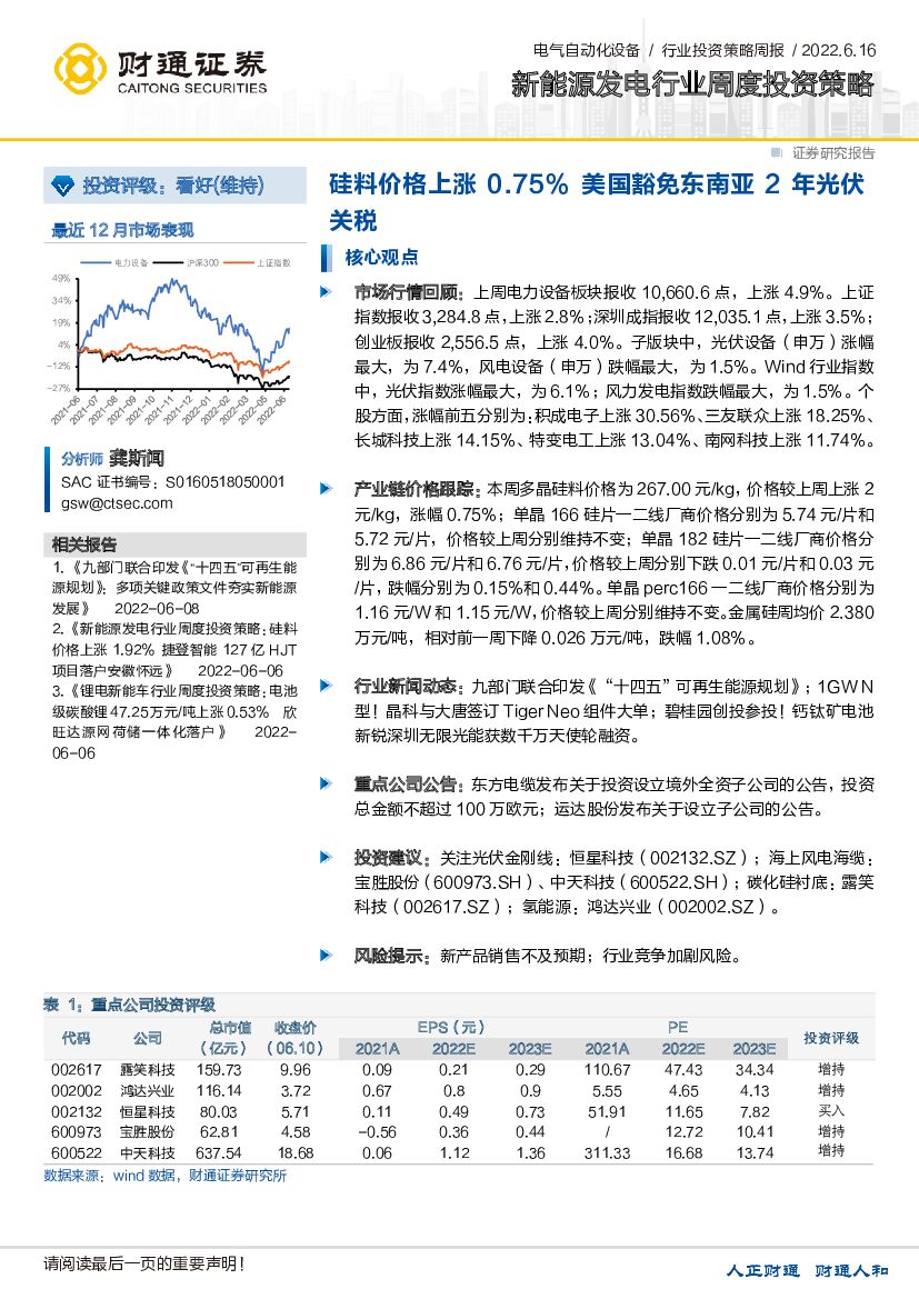财通证券:新能源发电行业周度投资策略:硅料价格上涨0.75% 美国豁免东南亚2年光伏关税.pdf