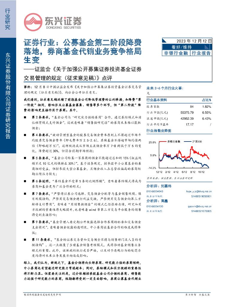 东兴证券:证券行业:证监会《关于加强公开募集证券投资基金证券交易管理的规定(征求意见稿)》点评:公募基金第二阶段降费落地,券商基金代销业务竞争格局生变.pdf