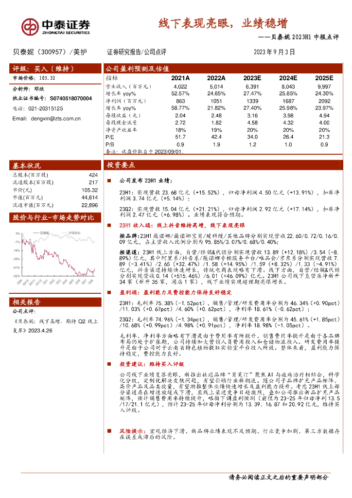 中泰证券:贝泰妮2023H1中报点评:线下表现亮眼,业绩稳增.pdf