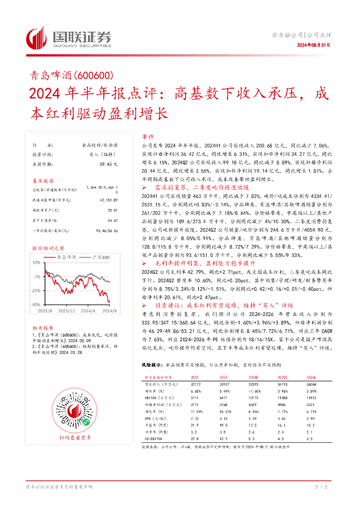 国联证券:青岛啤酒(600600)-2024年半年报点评:高基数下收入承压,成本红利驱动盈利增长.pdf