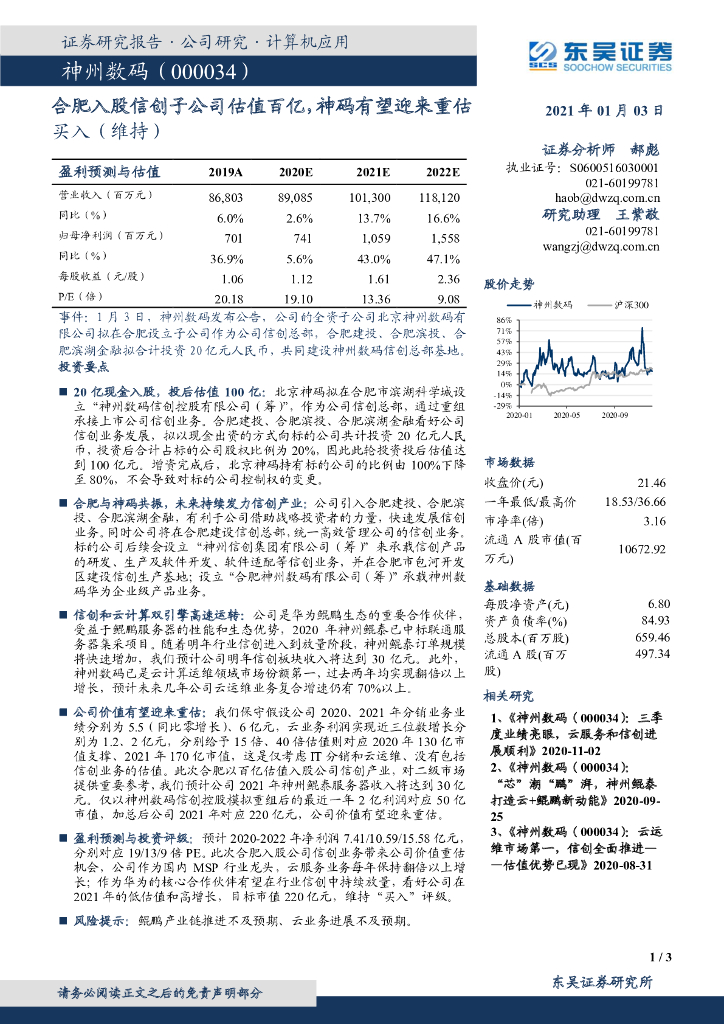 东吴证券:神州数码(000034)-合肥入股信创子公司估值百亿,神码有望迎来重估.pdf