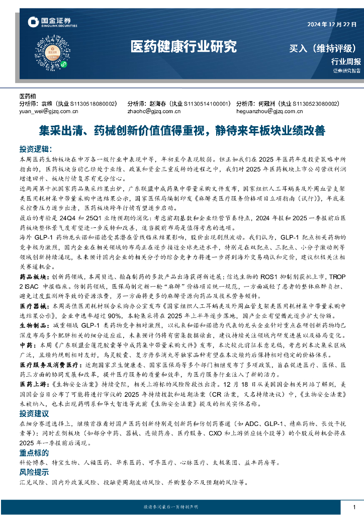 国金证券:医药健康行业研究:集采出清、药械创新价值值得重视,静待来年板块业绩改善.pdf