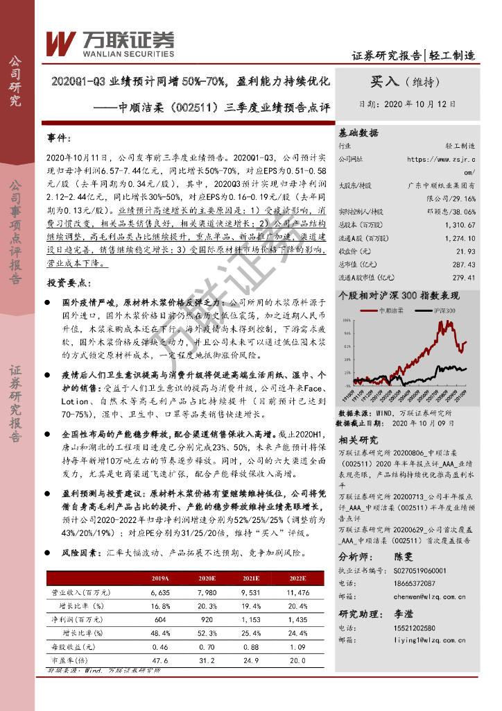 万联证券:中顺洁柔(002511)-三季度业绩预告点评:2020Q1-Q3业绩预计同增50%-70%,盈利能力持续优化.pdf