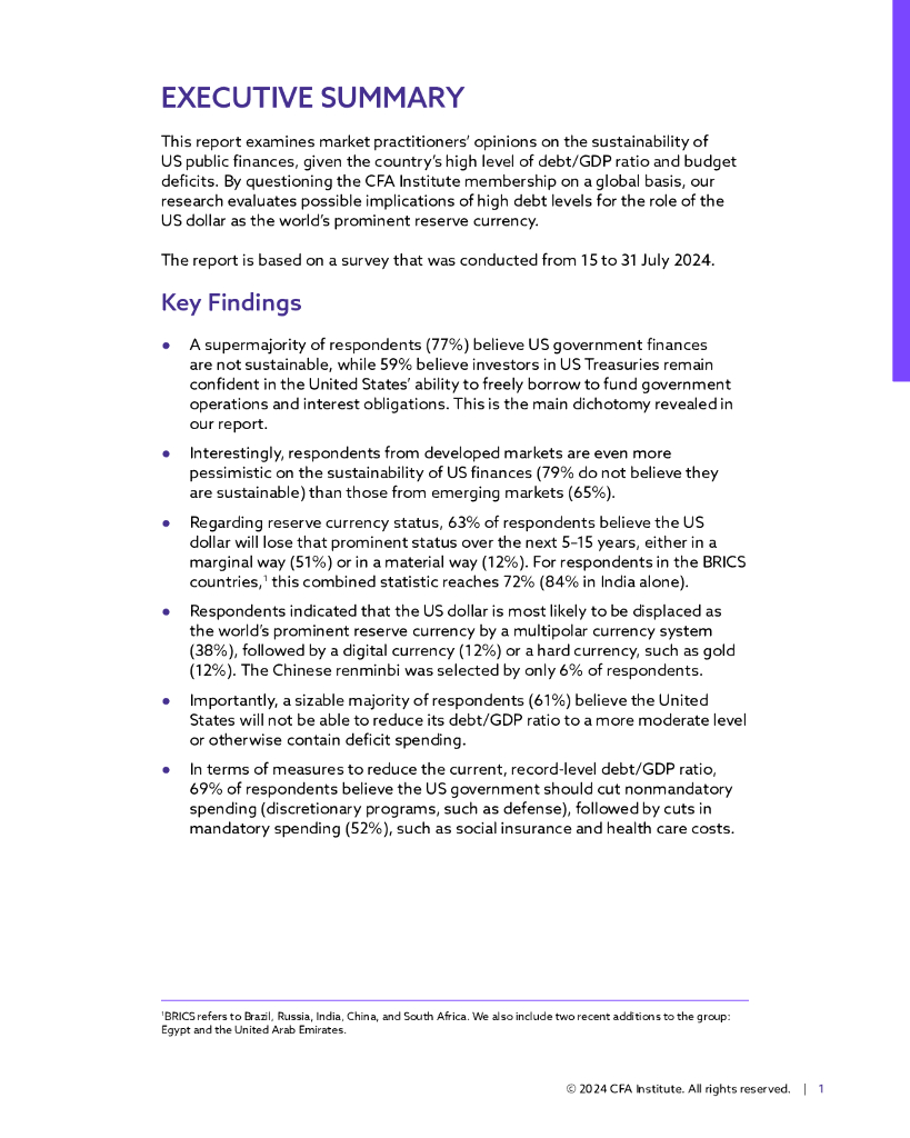 CFA Institute:2024年美元的过高特权-CFA协会关于美国债务和美元作用的全球调查报告(英文版).pdf