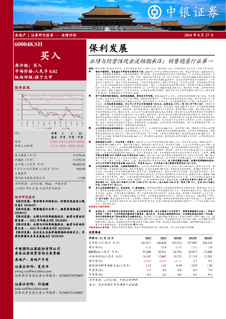 中银证券:保利发展(600048)-业绩与经营性现金流短期承压;销售稳居行业第一.pdf
